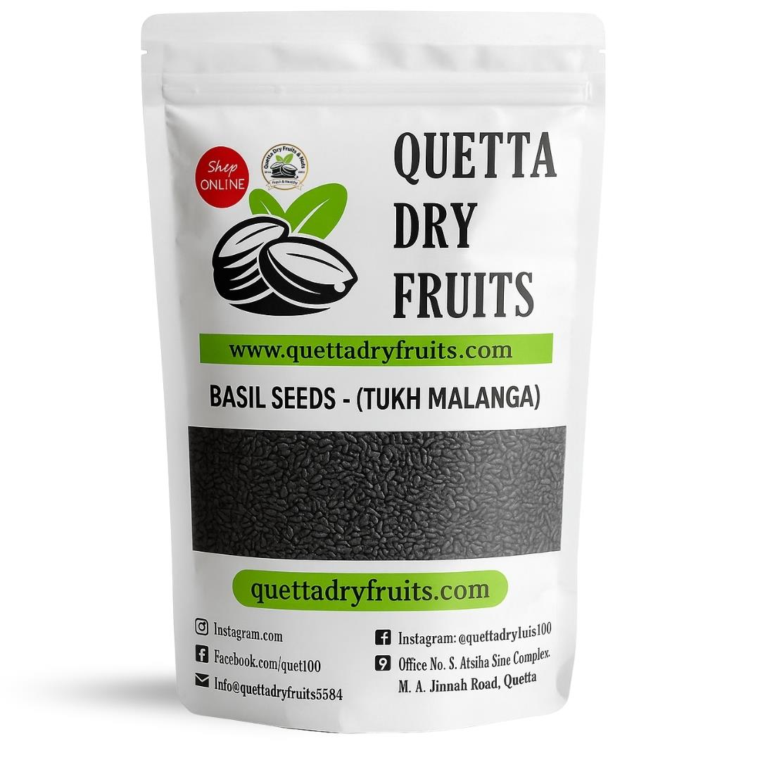 Basil Seeds, also known as Tukh Malanga (تخم ملنگا), are nutrient-rich super seeds packed with fiber, antioxidants, and essential minerals. Known for their cooling effect, they help in digestion, weight management, and keeping the body hydrated. Commonly used in drinks like falooda, lemonades, and detox waters, they swell in water to form a jelly-like texture. 100% natural and chemical-free — sourced and packed with care by Quetta Dry Fruits & Nuts.