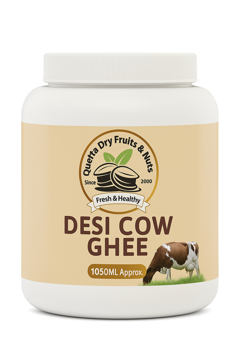 Experience the richness of purity with Quetta Dry Fruits & Nuts Desi Cow Ghee, crafted from the milk of grass-fed desi cows using traditional bilona methods. This premium ghee is a symbol of health, vitality, and authentic taste, bringing back the golden essence of nature into your daily life. From cooking and frying to skincare and Ayurvedic therapies, every spoonful of our ghee reflects quality, purity, and tradition. Whether you drizzle it over hot chapatis, cook your favorite dishes, or use it for wellness rituals — this is the ghee your family deserves. Choose Quetta Dry Fruits & Nuts Desi Cow Ghee for its unmatched aroma, taste, and purity, and bring the golden essence of nature back into your life.